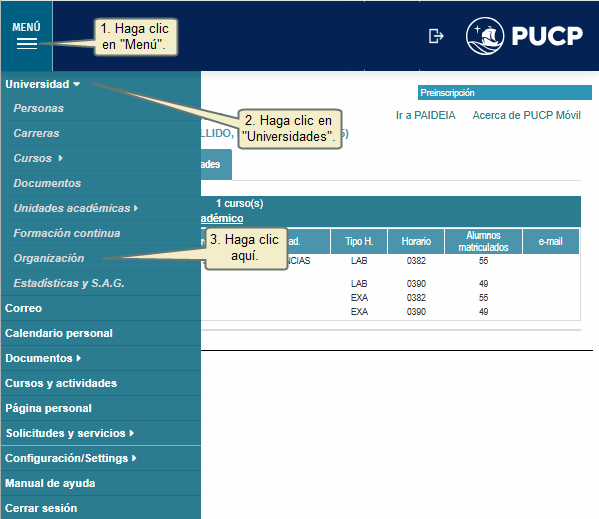 | Para ingresar a la opción variables étnicas, deberá hacer clic en el ícono Menú, luego haga clic en Universidad y seleccione Organización.