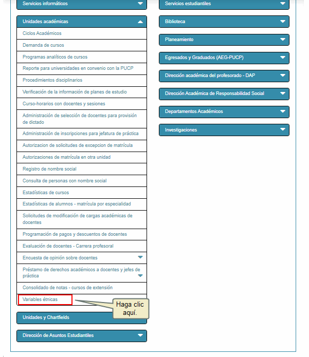 Ubique el panel Unidades académicas y haga clic en Variables étnicas.