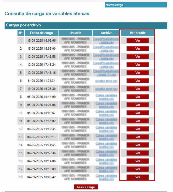 Al ingresar, visualizará una lista con todas las cargas de archivos realizadas. Para consultar el detalle de algún archivo deberá presionar el botón Ver de la columna Ver detalle.