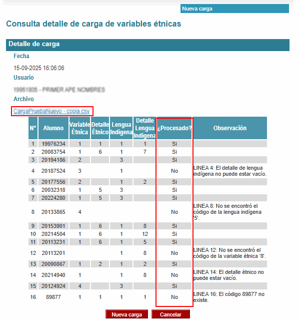 Se mostrará un cuadro con el detalle de las variables étnicas por alumno, indicando si fueron procesadas o no, junto con las obervaciones correspondientes. Asimismo, podrá descargar el archivo haciendo clic sobre el nombre del mismo.