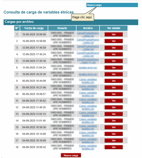 Para realizar una nueva carga, haga clic en Nueva carga, ubicada en la parte superior derecha.