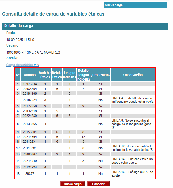 Una vez procesado el archivo, se mostrará el detalle de variables étnicas por alumno. La información de alumnos que no fue procesada se puede volver a cargar en un siguiente archivo, luego de su corrección.