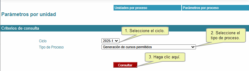 Después, seleccione el ciclo y tipo de proceso a consultar. Presione el botón Consultar.