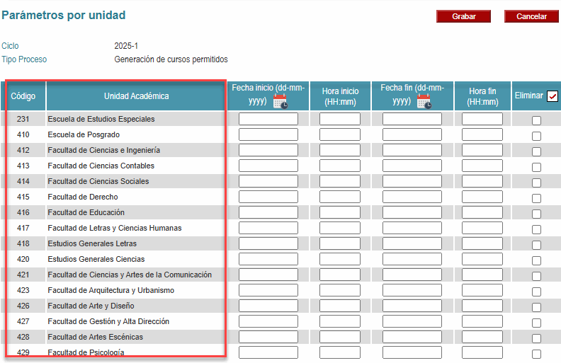 Si durante el proceso de inscripción virtual, alguna unidad solicita la apertura del sistema para realizar modificaciones de horarios, la Oficina Central de Registro debe habilitar lo siguiente: “Modificar oferta de cursos” y “Modificar calendario” para la unidad que solicita. Es importante que la Oficina Central de Registro informe a la unidad que realizar una modificación de sus horarios durante la inscripción podría generar un cruce a cualquier alumno, por tal motivo es de suma importancia que la unidad valide que no exista cruces y que informe a los alumnos ante cualquier inconveniente que se presente. Configuración de parámetros por unidad Permite que la Oficina Central de Registro realice la configuración de las fechas de inicio y fin de algunos procesos del proceso de la matrícula regular.