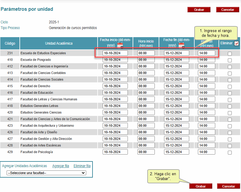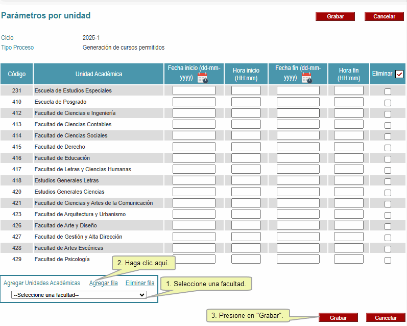 Adicionalmente, en caso se requiera borrar alguna unidad, se selecciona la unidad en la columna Eliminar. En caso se requiera agregar una unidad académica, en la parte inferior se muestra una facilidad para agregar alguna unidad. Una vez ingresada la información, presione Grabar.