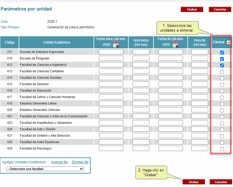 En caso se desee Eliminar alguna Unidad Académica, en la parte derecha observará la columna "Eliminar", donde podrá seleccionar las Unidades Académicas que requiera eliminar y haga clic en el botón Grabar.