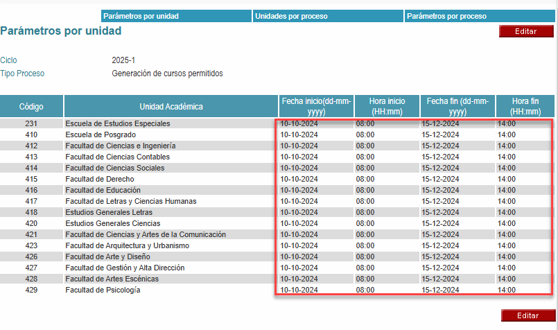 A continuación se mostrará la lista de unidades que participarán del proceso. Haga clic en Editar para visualizar la lista completa de las unidades académicas.