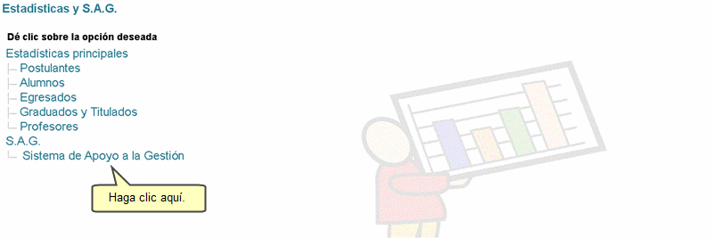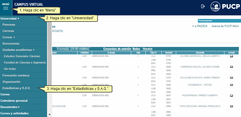 Para ingresar, seleccione "Menú", luego "Universidad" . A continuación, haga clic en "Estadísticas y S.A.G".