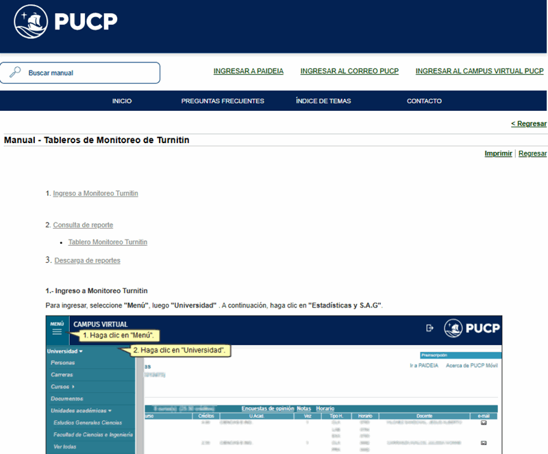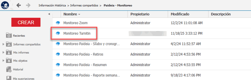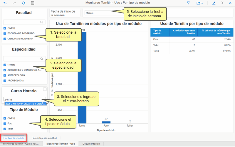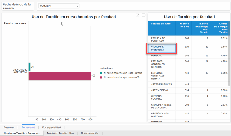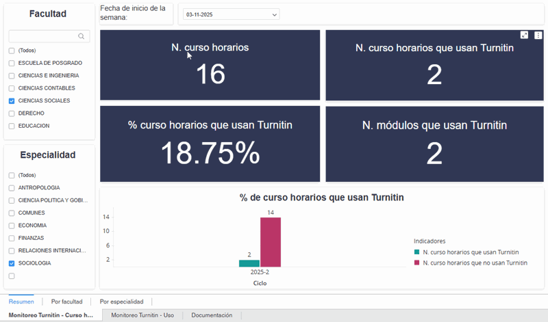 Seguidamente, podrá observar la información consolidada del porcentaje de curso-horarios que usan Turnitin.