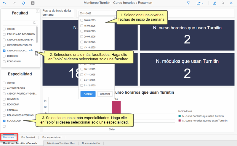 Seleccione la fecha de inicio de la semana que se desea analizar. Luego, si lo desea, seleccione la facultad y la especialidad del curso.