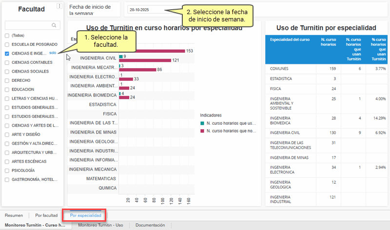 La página Por Especialidad muestra la información sobre el número de curso-horarios por especialidad, el número de curso-horarios que usan Turnitin por especialidad, el número de curso-horarios que no usan Turnitin por especialidad y el porcentaje de curso-horarios que usan Turnitin por especialidad.