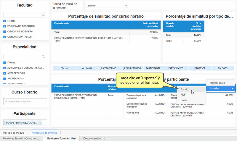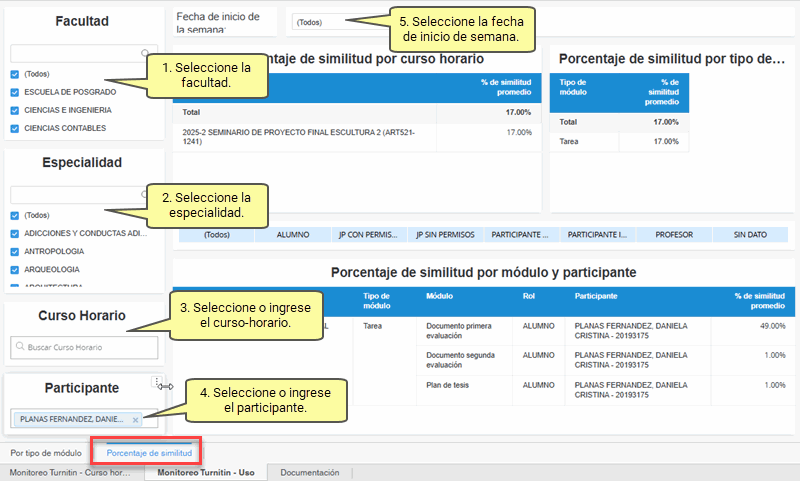 La página Porcentaje de Similitud muestra el porcentaje de similitud por curso-horario, el porcentaje de similitud por tipo de módulo y el porcentaje de similitud por módulo y participante.