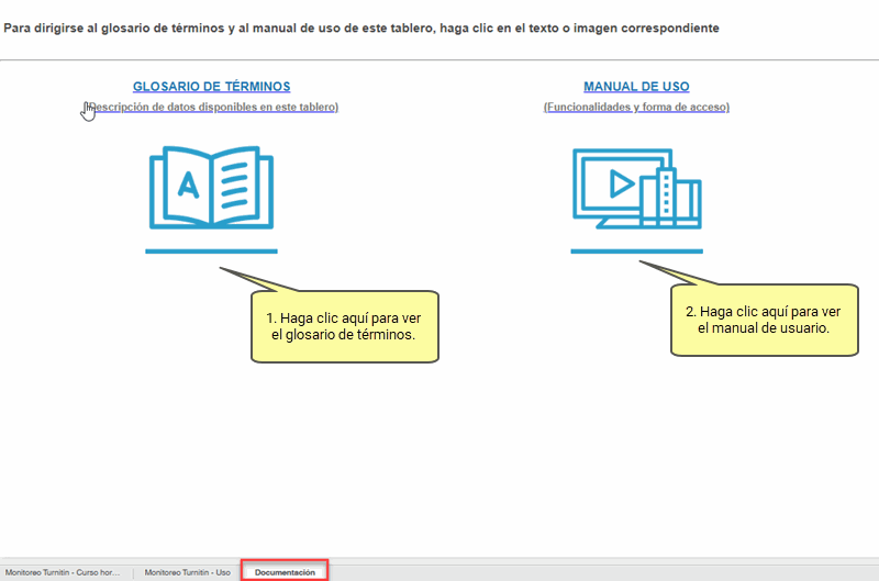 Puede hacer clic en el primer ícono para ver el glosario de términos y el segundo para ver el manual de uso correspondiente.