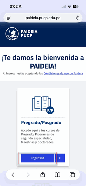 Para poder obtener más información sobre su curso en PAIDEIA, debe acceder al enlace en la parte inferior de la pantalla del curso. Luego, haga clic en el botón Ingresar correspondiente al tipo de curso que desea consultar (Pregrado/Posgrado o Educación Continua).