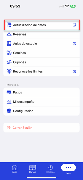 Esta opción está visible y disponible solo para estudiantes de pregrado. Para ingresar a esta opción debe presionar la opción ubicado en el menú inferior, luego presionar la opción que lo redireccionará a un formulario de actualización de datos, a través de su navegador. Para una mayor explicación de esta opción haga clic aquí.