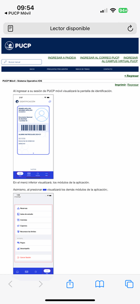 La opción Manual de ayuda lo redirige al manual PUCP Móvil IOS en el Campus Virtual.