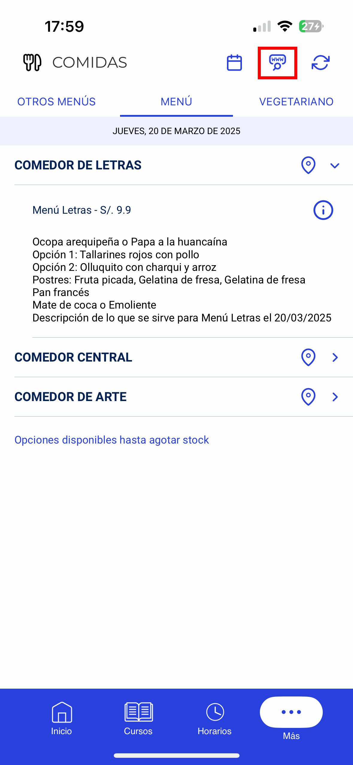Visualizará la programación de platos para el día actual, el costo del mismo y la disponibilidad para los alumnos en cada una de las cafeterías.