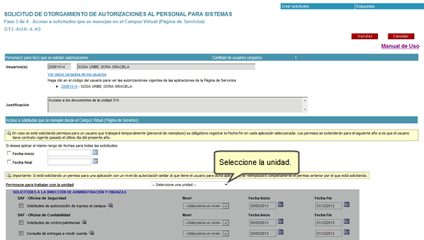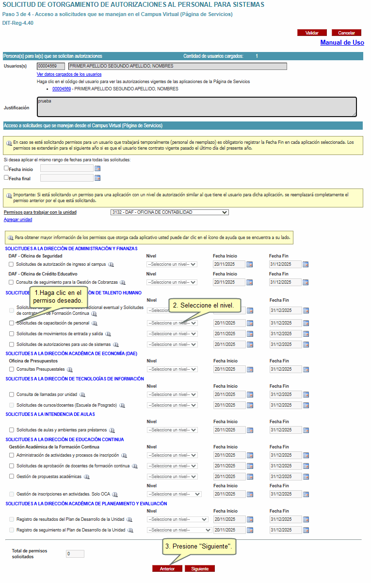 Al seleccionar la unidad, visualizará un listado de solicitudes organizados por la Unidad responsable del mismo sobre las cuales podría pedir permisos en varios niveles. Para seleccionar cada una, haga clic sobre el recuadro ubicado a la izquierda de cada solicitud, especifique el Nivel, la Fecha Inicio y la Fecha Fin. Una vez que haya concluido, haga clic en Siguiente.