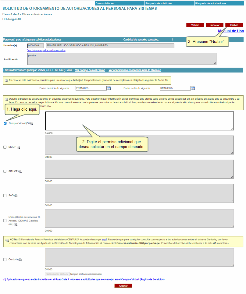 Luego, encontrará una opción para solicitar otras autorizaciones que no han sido consideradas en la página anterior. Para ello, seleccione el sistema y describa el permiso que requiere. Al finalizar, haga clic en Grabar.