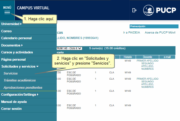 | Para realizar un retiro de autorizaciones en el Campus Virtual, haga clic en el ícono menú, seguido de Solicitudes y servicios y por último presione Servicios.