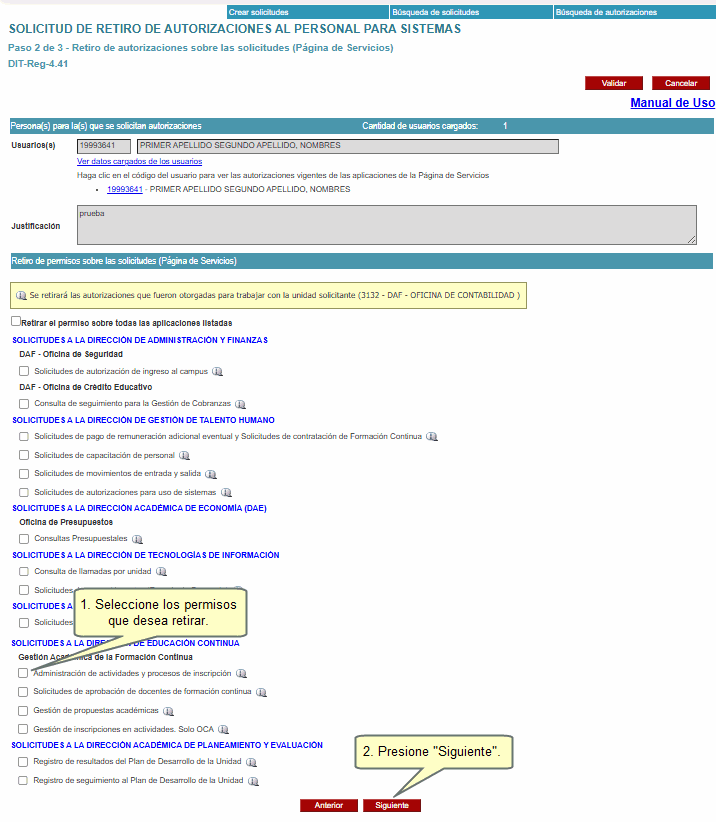 Nota: Tome en cuenta que si el usuario que ha registrado no se encuentra activo o es jubilado, los permisos se perderán una vez aprobada la solicitud sin que este tenga un VB° de la Dirección de Recursos Humanos.