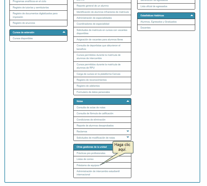 Para ingresar sitúe el cursor en la sección Universidad y haga clic en la opción Unidades Académicas. Luego seleccione la facultad que desea ingresar.