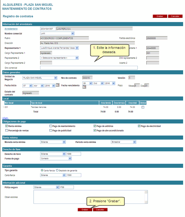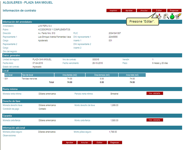 Si desea editar la información de un contrato, ingrese al contrato y presione el botón Editar.
