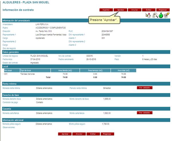 Si desea aprobar la información de contrato, presione el botón Aprobar.