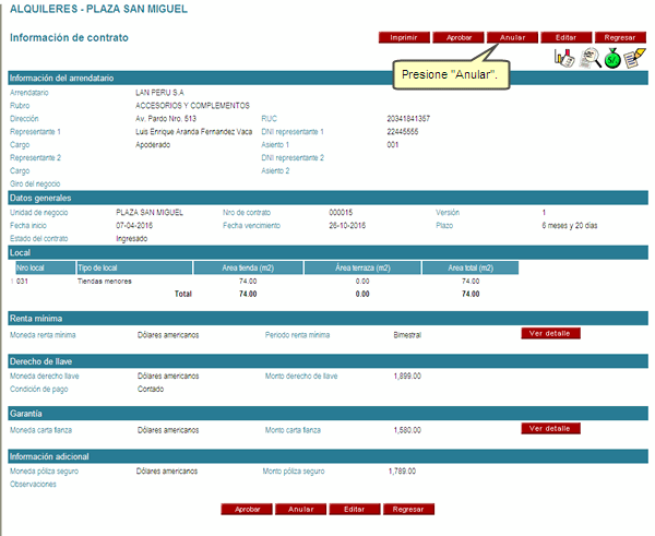 Si desea puede anular el contrato; para ello, presione el botón Anular.