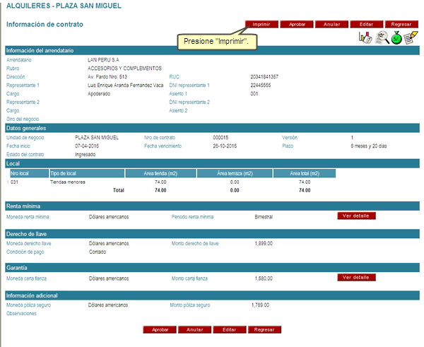 Si desea imprimir la información de contrato, presione el botón Imprimir.