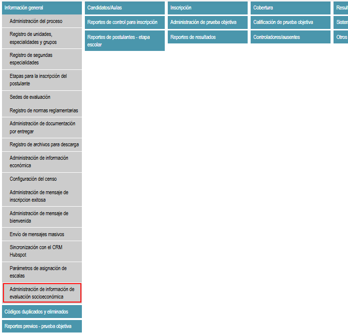 En la sección Información general, deberá seleccionar la opción Administración de información de evaluación socioeconómica.
