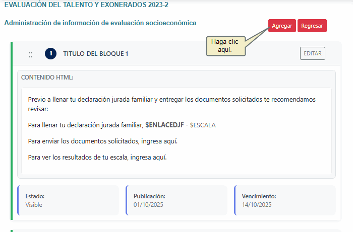 Podrá Agregar un bloque de información para el postulante haciendo clic en el botón señalado: