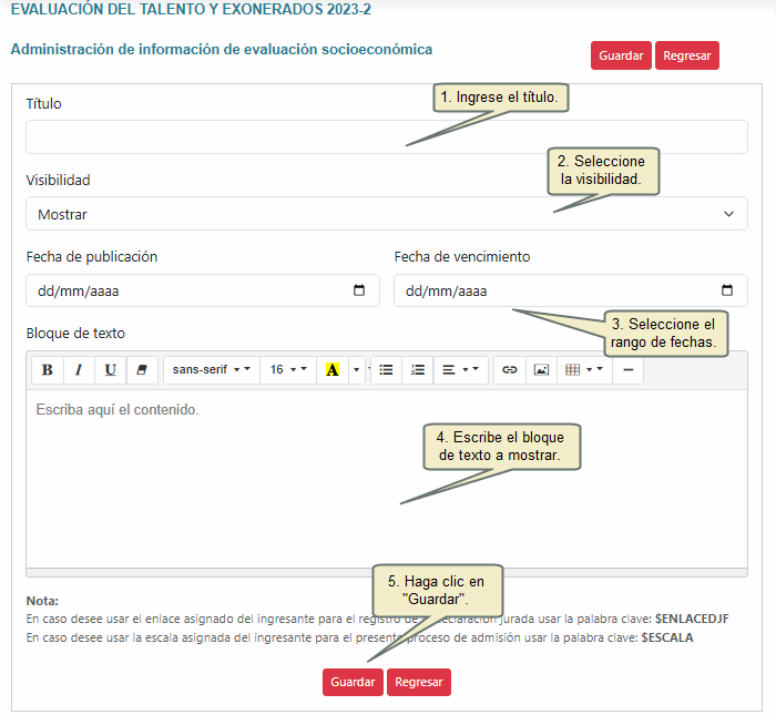 - Deberá ingresar el texto informativo en el Bloque de texto. En la parte inferior de la pantalla se mostrará un recuadro informativo que indica que, si desea incluir el enlace a la declaración jurada del postulante, se debe utilizar la palabra clave $ENLACEDJF; y en caso se desee mostrar la escala asignada, $ESCALA.