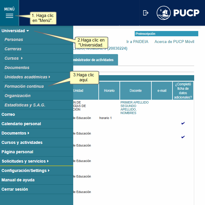 Para la atención de solicitudes de Restablecimiento de contraseña deberá ingresar al Campus Virtual, darle clic en Menú, seleccionar Universidad y luego Formación Continua.