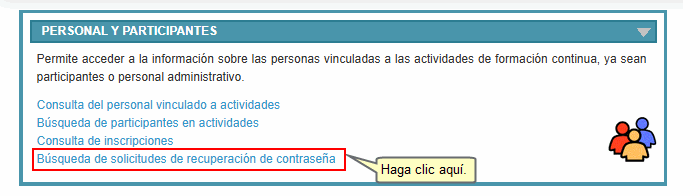 En la sección Personal y Participantes, haga clic en la opción Búsqueda de solicitudes de recuperación de contraseña.