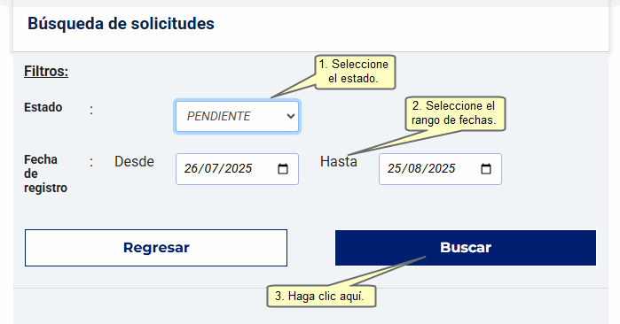 A continuación, se le pedirá completar los filtros de búsqueda. Primero seleccione el estado a consultar, después seleccione el rango de fechas de registro, y presione el botón Buscar para efectuar la búsqueda.