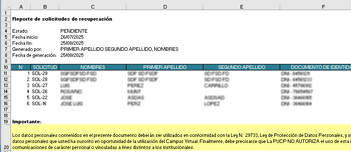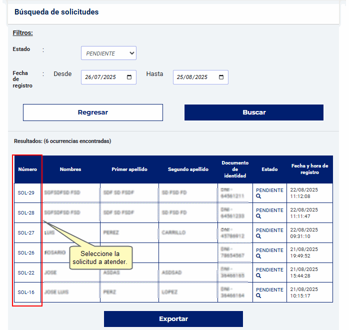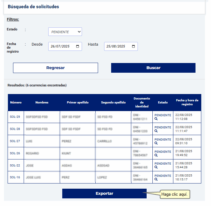 Si desea descargar la lista de solicitudes, haga clic en el botón Exportar.