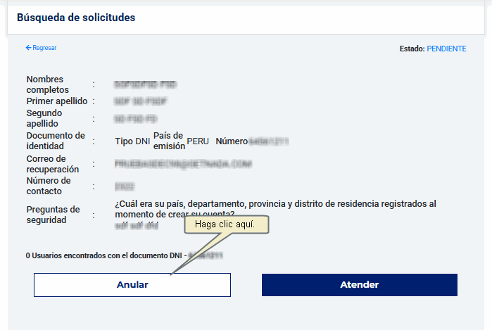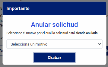 Aparecerá una ventana emergente donde deberá seleccionar el motivo de porque la solicitud será anulada, y luego, presione el botón Grabar.