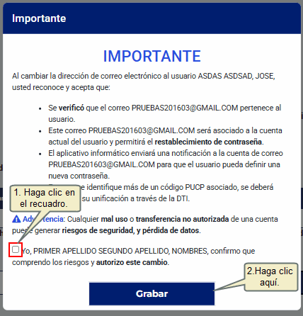 Aparecerá una ventana emergente para confirmar la verificación de la información. Marque el recuadro y haga clic en el botón Grabar.