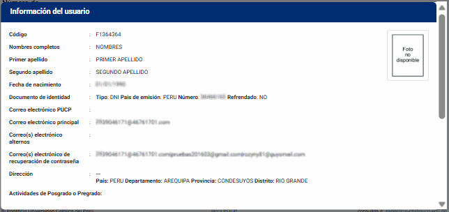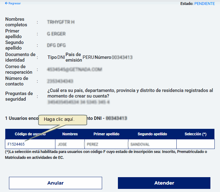 Visualizará la información registrada de la solicitud del alumno. Puede consultar la información del usuario al hacer clic al enlace del código del usuario