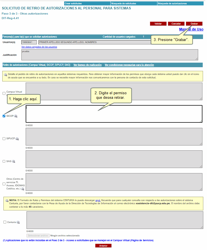 Nota: Tome en cuenta que si el usuario que ha registrado no se encuentra activo o es jubilado, los permisos se perderán una vez aprobada la solicitud sin que este tenga un VB° de la Dirección de Recursos Humanos.