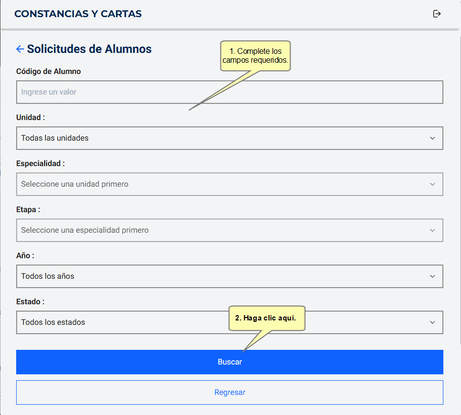 Podrá realizar una búsqueda especializada de las solicitudes creadas, para ello deberá completar los campos que desee filtrar y, después, hacer clic en el botón Buscar.
