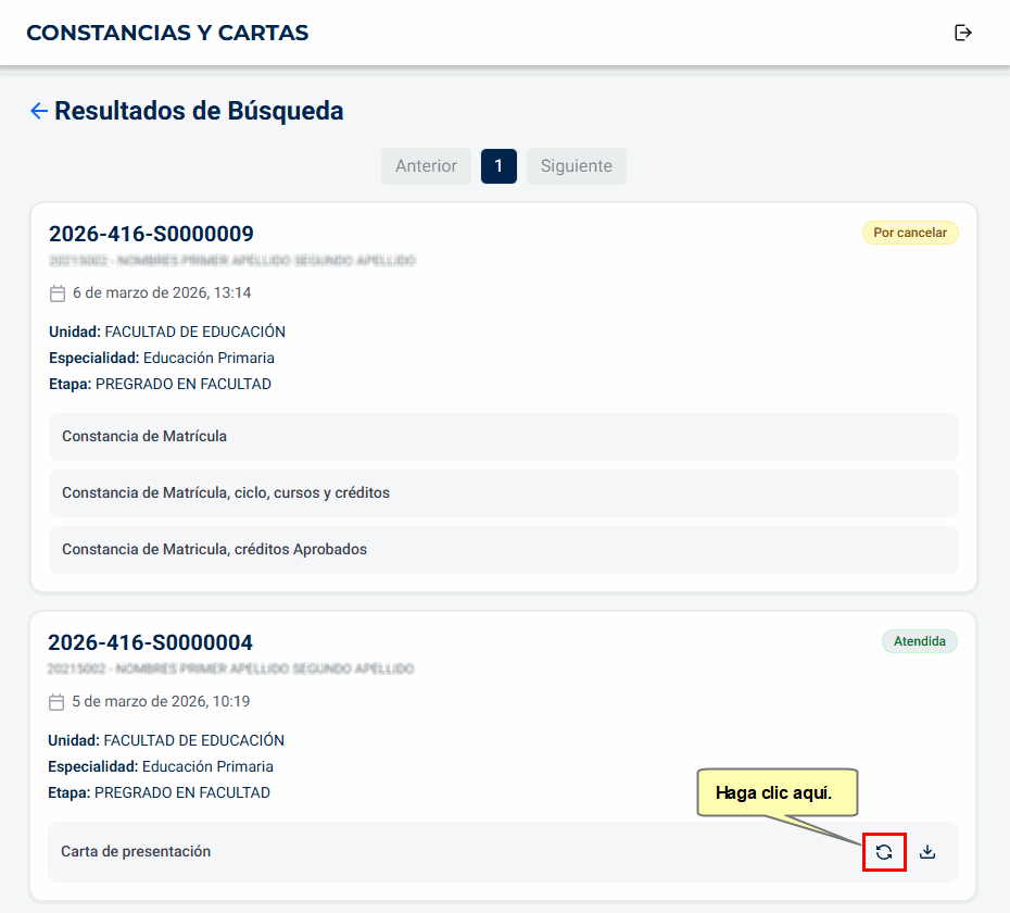 Asimismo, en caso sea necesario actualizar la información de una solicitud ya atendida, deberá presionar el icono , el cual permite generar nuevamente la constancia con los datos actualizados, sin realizar un nuevo pago.
