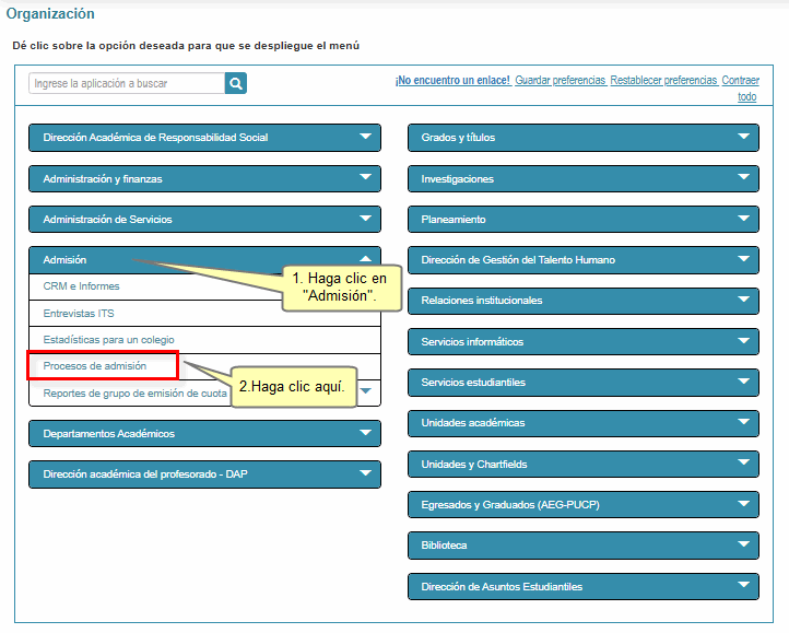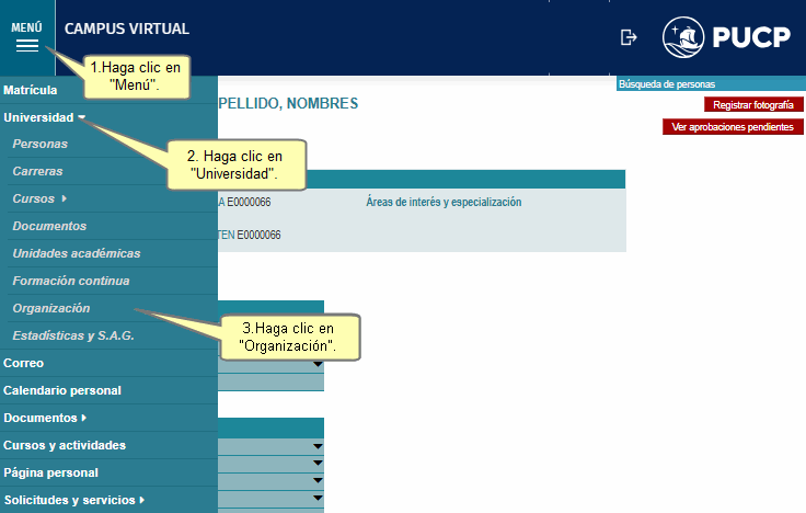 Para ingresar, haga clic en Menú; a continuación, haga clic en Universidad y luego seleccione Organización.