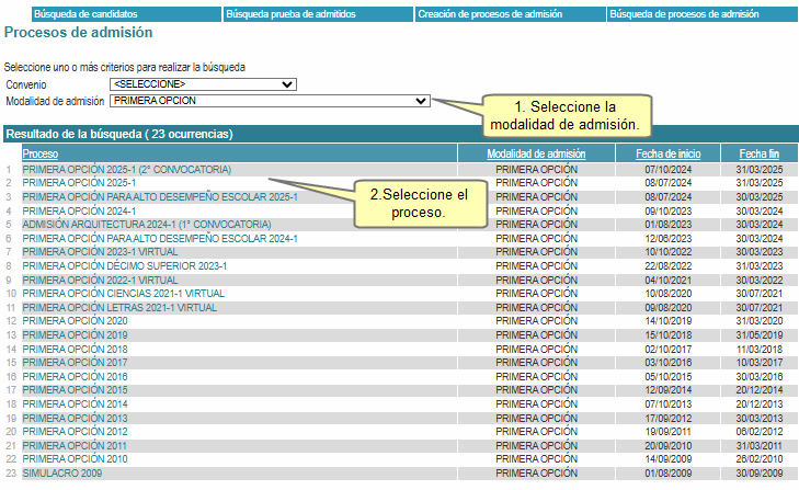 Se mostrará la siguiente pantalla. Seleccione la modalidad de admisión; esta debe pertenecer a la etapa de pregrado. Luego, seleccione un proceso de admisión.