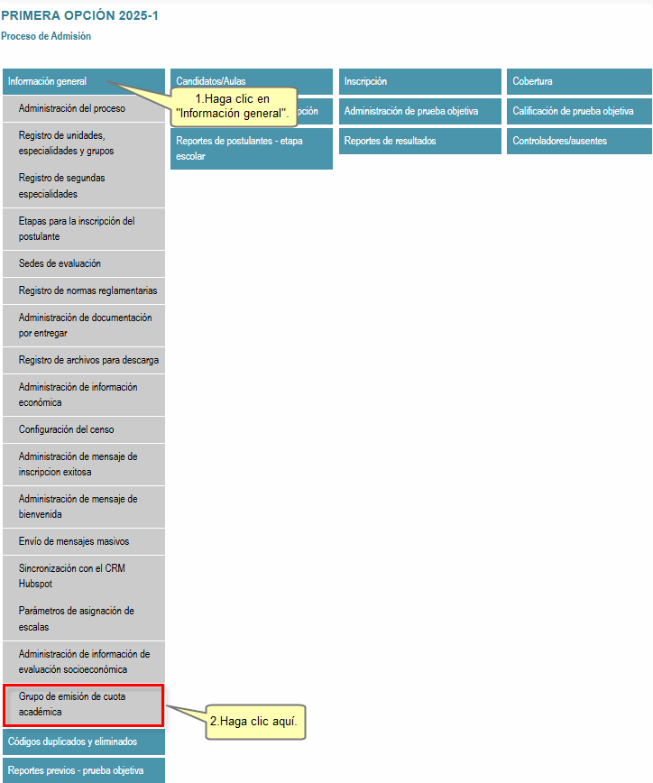 Observará el panel del proceso de admisión seleccionado. Haga clic en el bloque Información general y, dentro de este, en la opción Grupo de emisión de cuota académica.