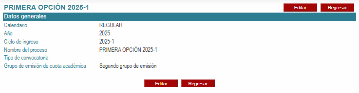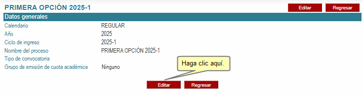 Seguidamente, haga clic en el botón Editar. Tener en cuenta que sólo se podrá actualizar el grupo de emisión de cuota académica (estará visible el botón Editar) mientras no nos encontremos dentro de las fechas de emisión de la cuota académica para el ciclo correspondiente al proceso de admisión.