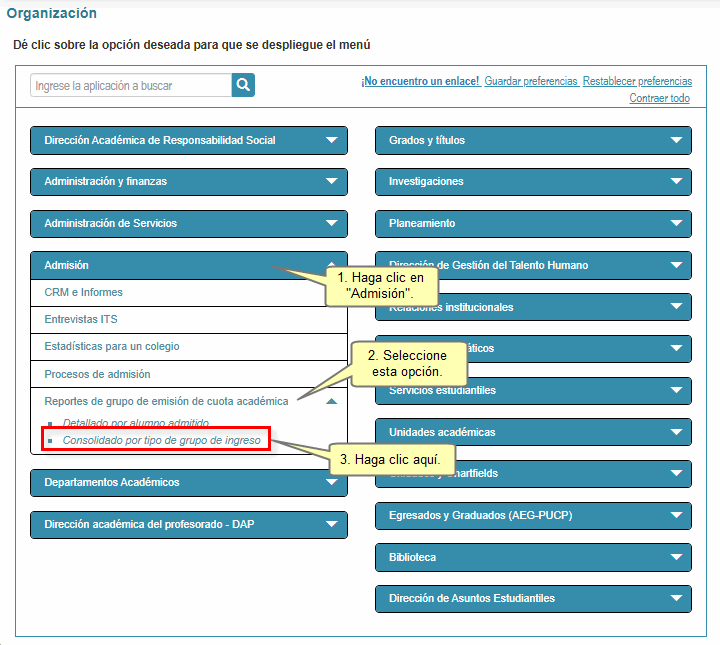Para acceder a este reporte, en el Panel de Organización de Campus Virtual seleccionar dentro del bloque Admisión, la opción Consolidado por tipo de grupo de ingreso ubicada dentro del menú Reportes de grupo de emisión de cuota académica, y que sólo se visualiza si el usuario tiene asignado el permiso correspondiente.