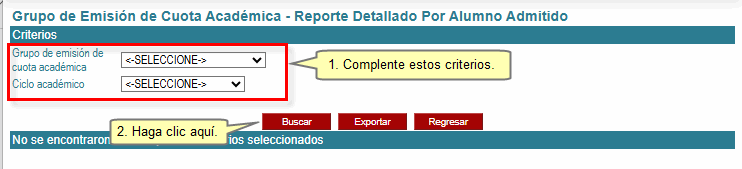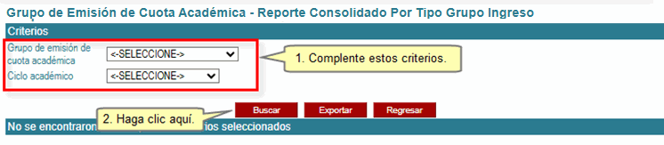 Luego, deberá seleccionar obligatoriamente los criterios Grupo de emisión de cuota académica y Ciclo académico; caso contrario, se mostrará una ventana emergente de error. Por último, haga clic en el botón Buscar.