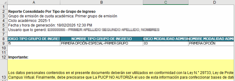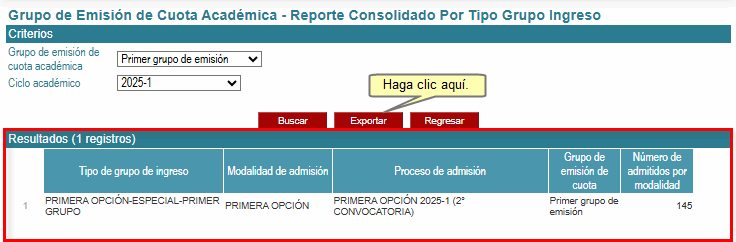 Como resultado de la búsqueda, se mostrará en la parte inferior la relación consolidada por tipo de grupo de ingreso de los alumnos admitidos pertenecientes a procesos de admisión de pregrado del ciclo académico y grupo de emisión de cuota académica seleccionados.